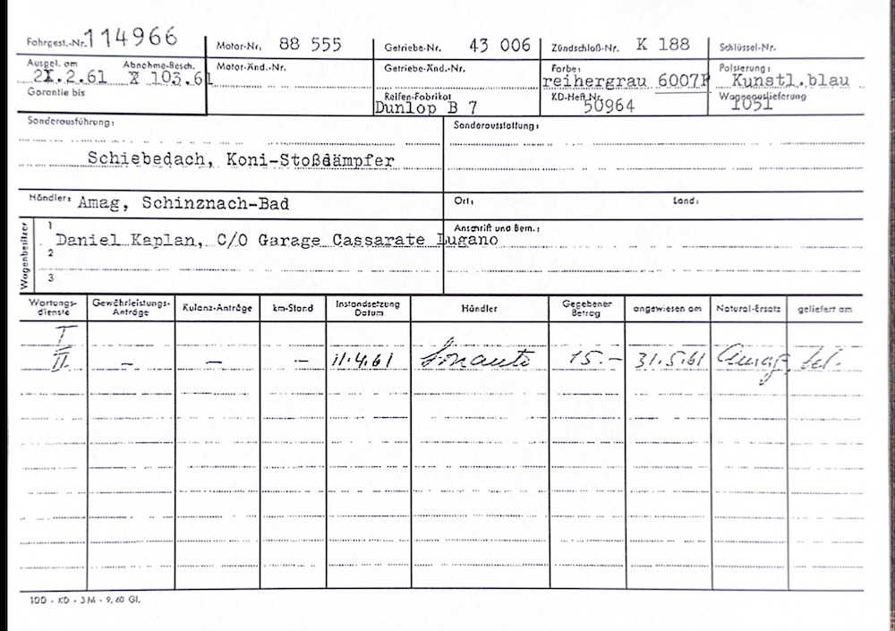 A recent Barn find just out of 53 year ownership. A rare originally Heron Grey / Blue car with Sunroof and Super engine. Swiss delivered, Painted Silver a long time ago. Overall good condition with some rust in the usual places, Runs. With some work this can be a great Patina driver. Lots of paperwork from 1972 till parked in '81! Blank case, C transaxle, Just $57,500.